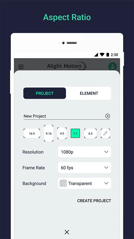 في بداية الأمر عليك بفتح تطبيق لايت موشن برو Alight Motion مهكر على هاتفك الاندرويد, وبعد ذلك قُم بالضغط على علامة ( + ) الموجودة في أسفل واجهة التطبيق لكي تقوم بإنشاء مشروع جديد, وسيظهر لك صفحة تفاصيل مشروع الفيديو الجديد, كُل ماعليك الان هو كتابة إسم الـ Project الخاص بِك لكي تتمكن من العودة له فيما بعد واستكمال التعديل على الفيديو, وبعد ذلك يُمكنك اختيار أبعاد الفيديو التي تُريدها كما هو مُشار اليها في الصورة الموضحة امامك الان.