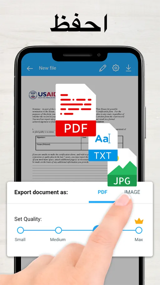 - الجودة : كما يحتوي “تطبيق TapScanner Apk مهكر” برابط مباشر من ميديا فاير على ميزة الحفظ بجودة عالية بالإضافة إلى أن المستخدم يستطيع تحديد الجودة المرادة للحفظ بها.